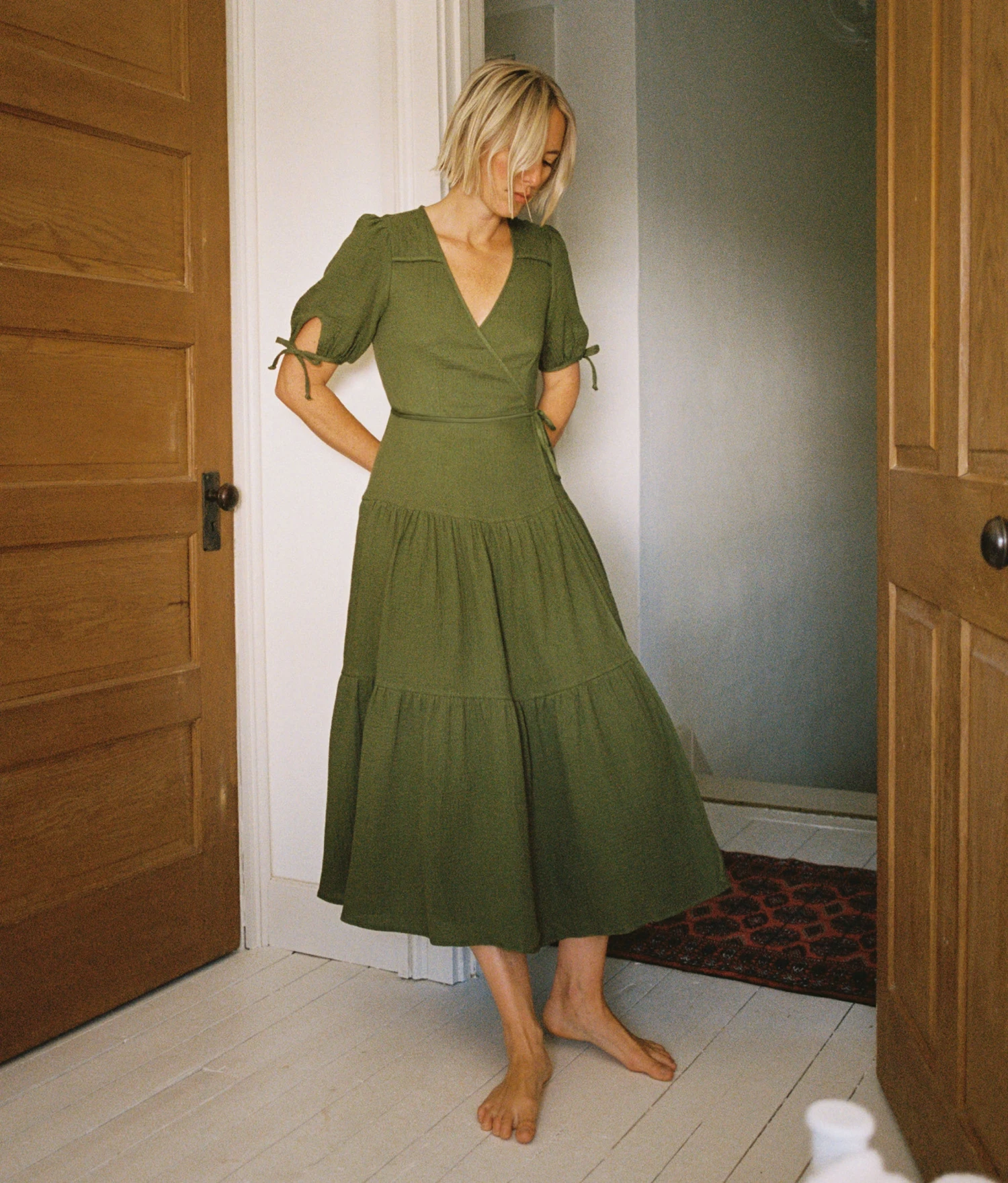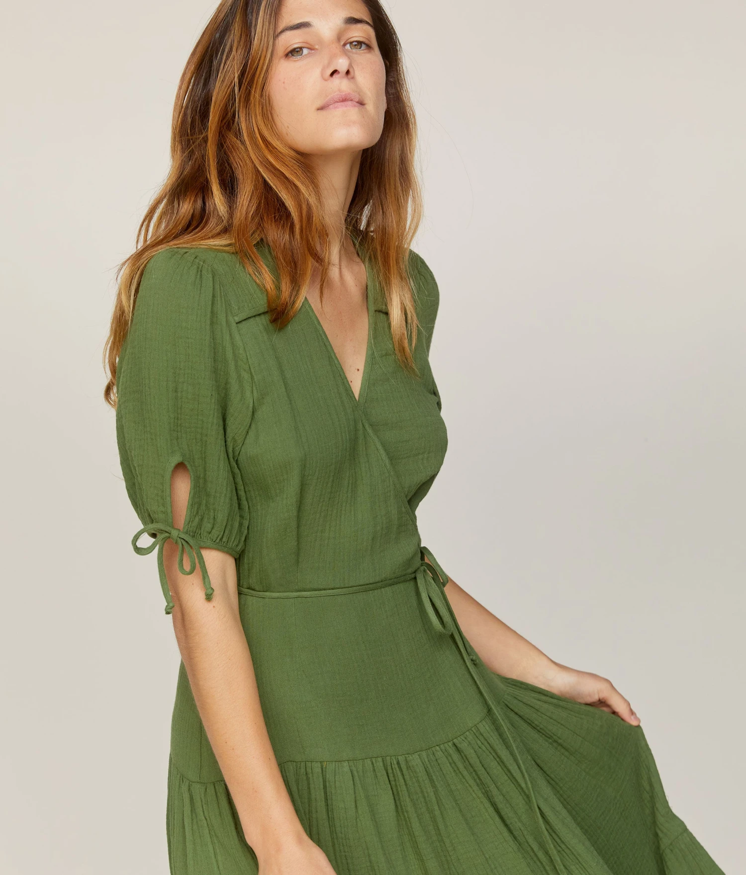 - Short-sleeved adjustable wrapped midi dress