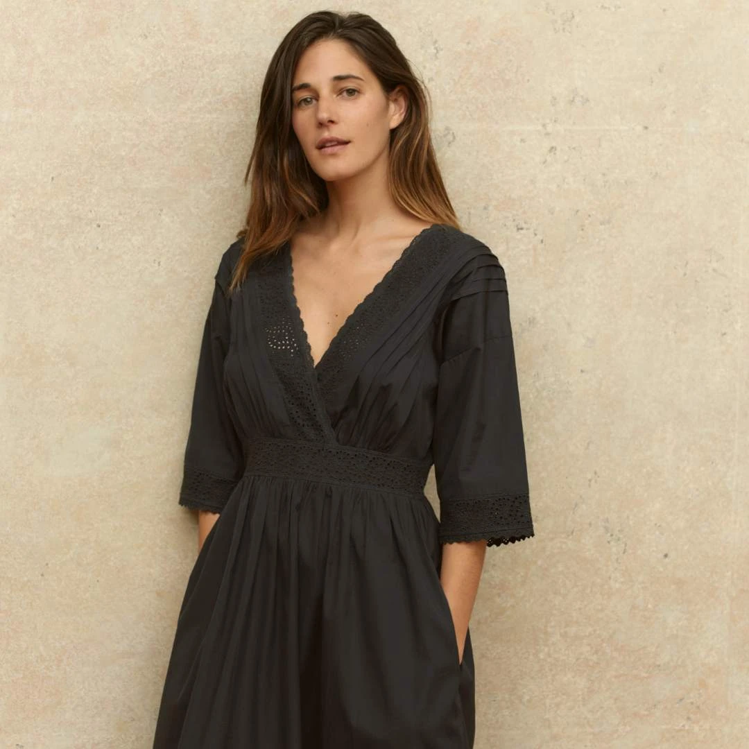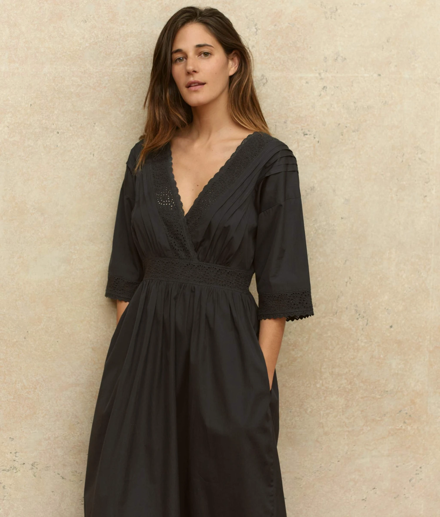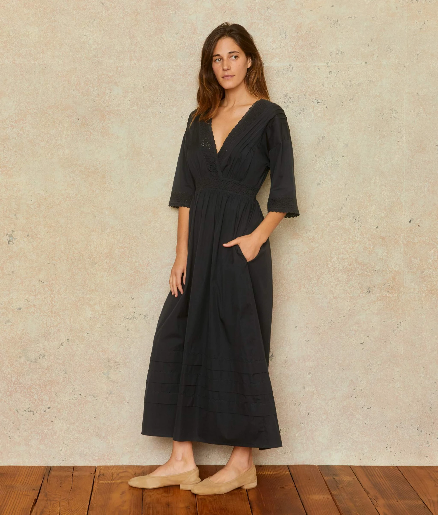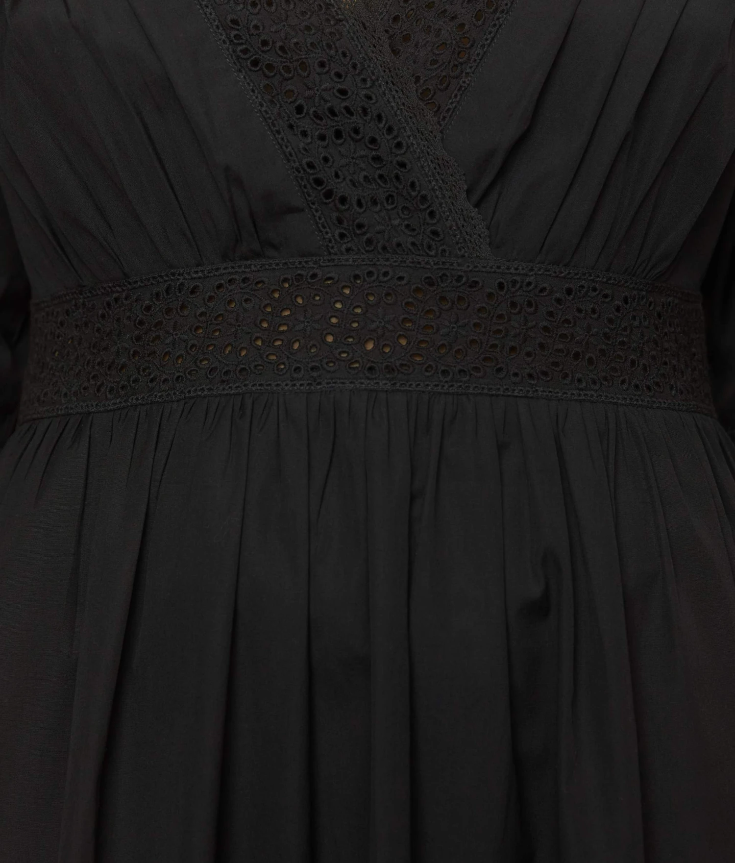 - Surpliced front and back bodice with pintucks at dropped shoulder