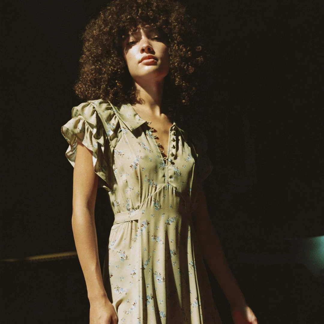 - Ruffles on sleeve, ruffle at hem, godets on skirt